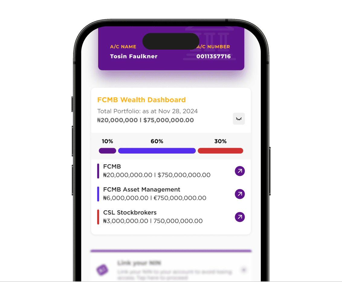 The wealth dashboard is a feature on the FCMB mobile app and internet banking.